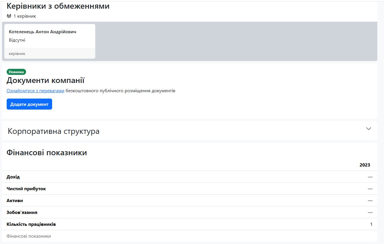 Щодо управління — спершу керівником зазначався Шевченко Тарас Миколайович, пізніше його місце зайняв Котеленець Антон Андрійович. [Opendatabot — ЮМС історія змін]