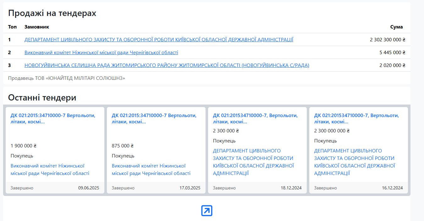 Попри це, вже у 2024 році компанія з одним працівником та статутним капіталом у тисячу гривень починає вигравати масштабні державні тендери. За даними системи Clarity Project, загальна сума підписаних контрактів перевищила 2,3 мільярда гривень. Найбільший із них — угода з Департаментом цивільного захисту Київської обласної державної адміністрації на постачання «вертольотів, літаків і космічного обладнання». Серед замовників також значаться Ніжинська міська рада та Новогуйвинська селищна рада Житомирської області, які укладали з «ЮМС» угоди на мільйони гривень, нібито для закупівлі авіаційної та космічної техніки.